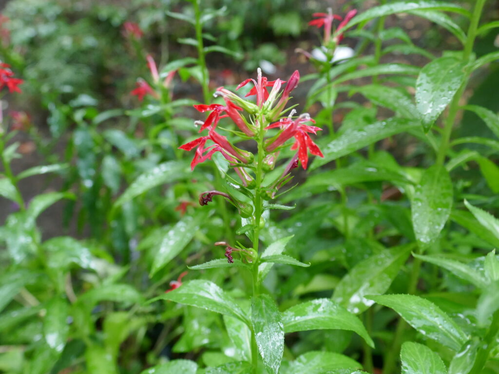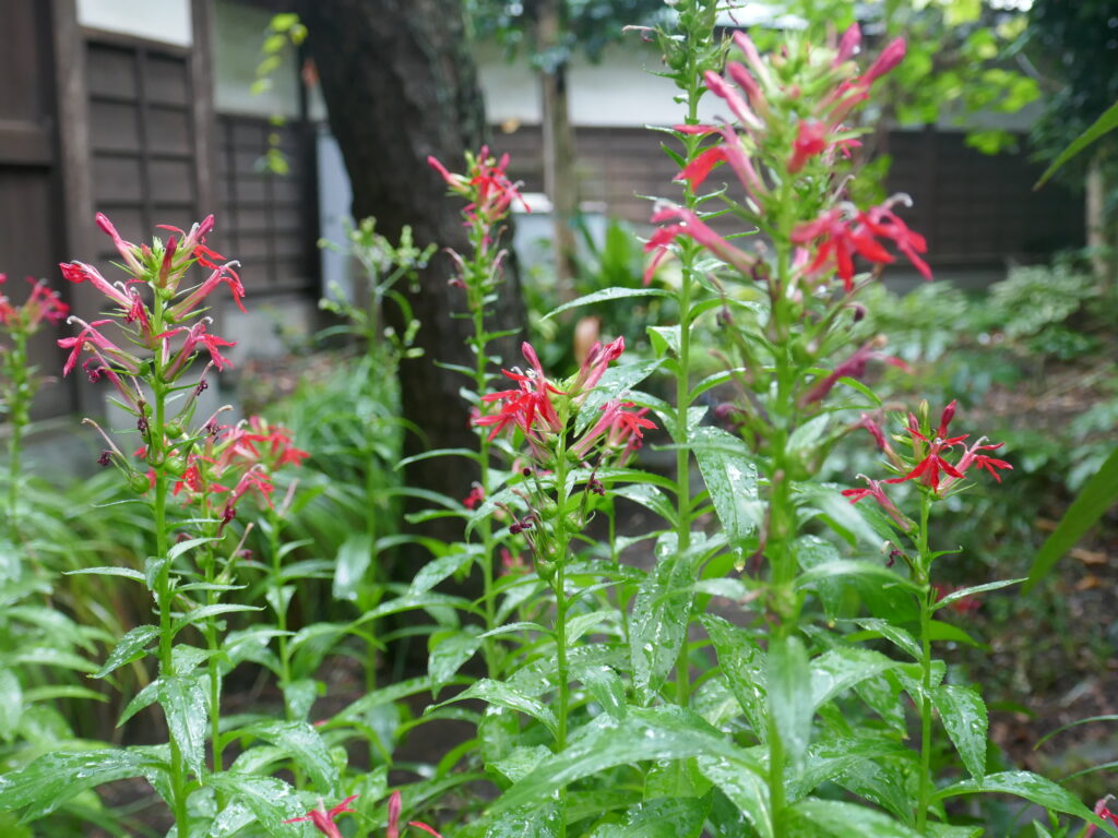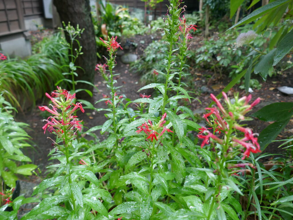 ベニバナサワギキョウは、鮮やかな赤色の花をつけ夏から秋にかけて咲き、