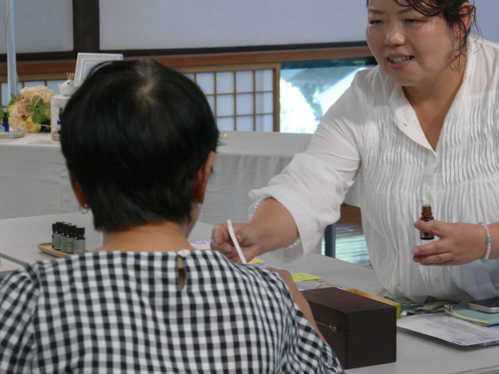 試香紙という、長細い紙に精油をしみ込ませて、皆様に配り嗅いで頂きます。