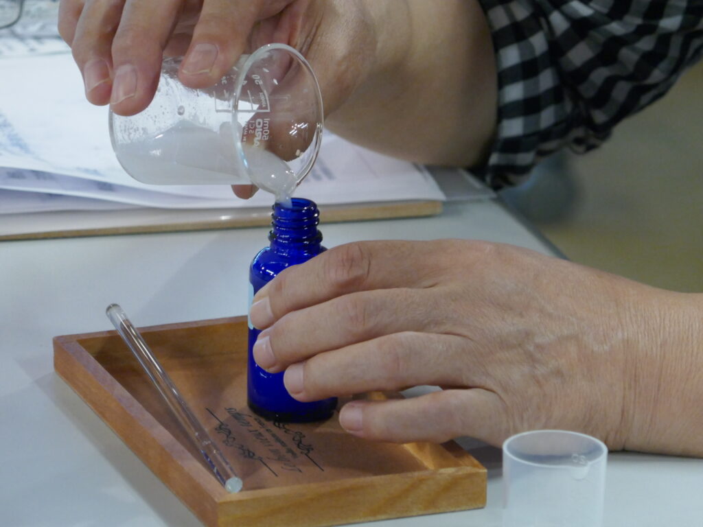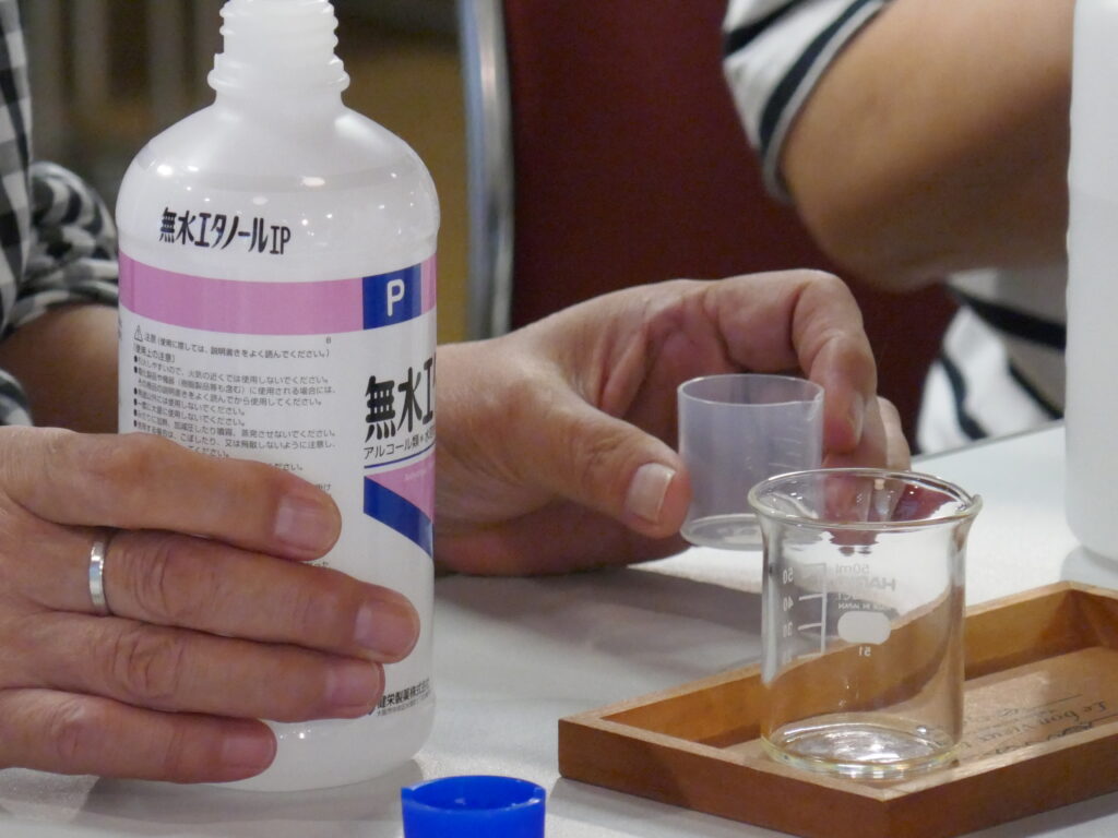 精油と無水エタノールを、ガラス棒でよくかき混ぜます。