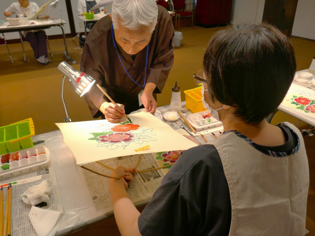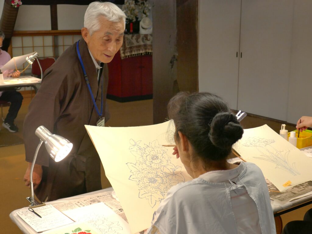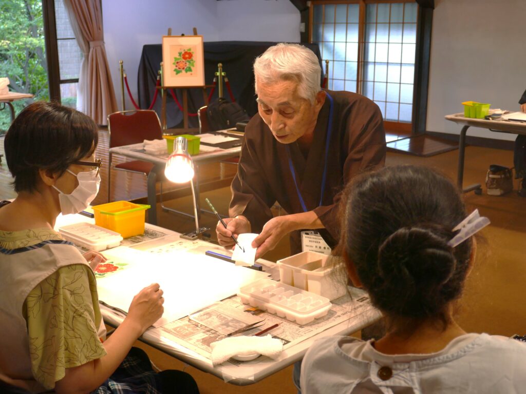 阿部先生の色挿しを間近で見られるのも、耕心館友禅体験講座の醍醐味の一つです。
