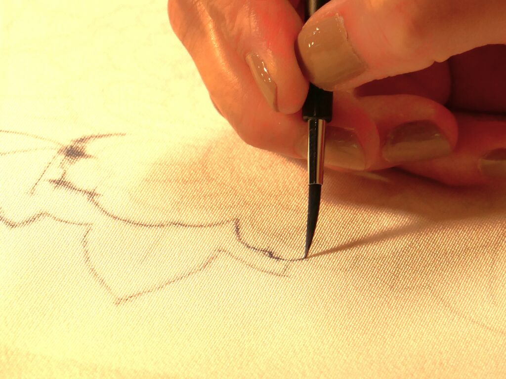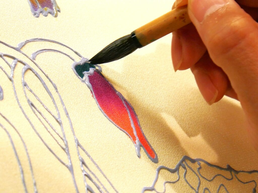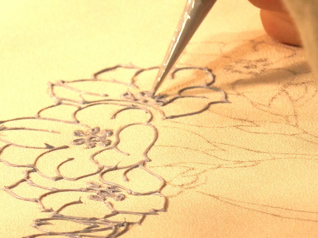 糸目糊を置くと布の繊維に食い込み、染料が流れ出ないようになります。