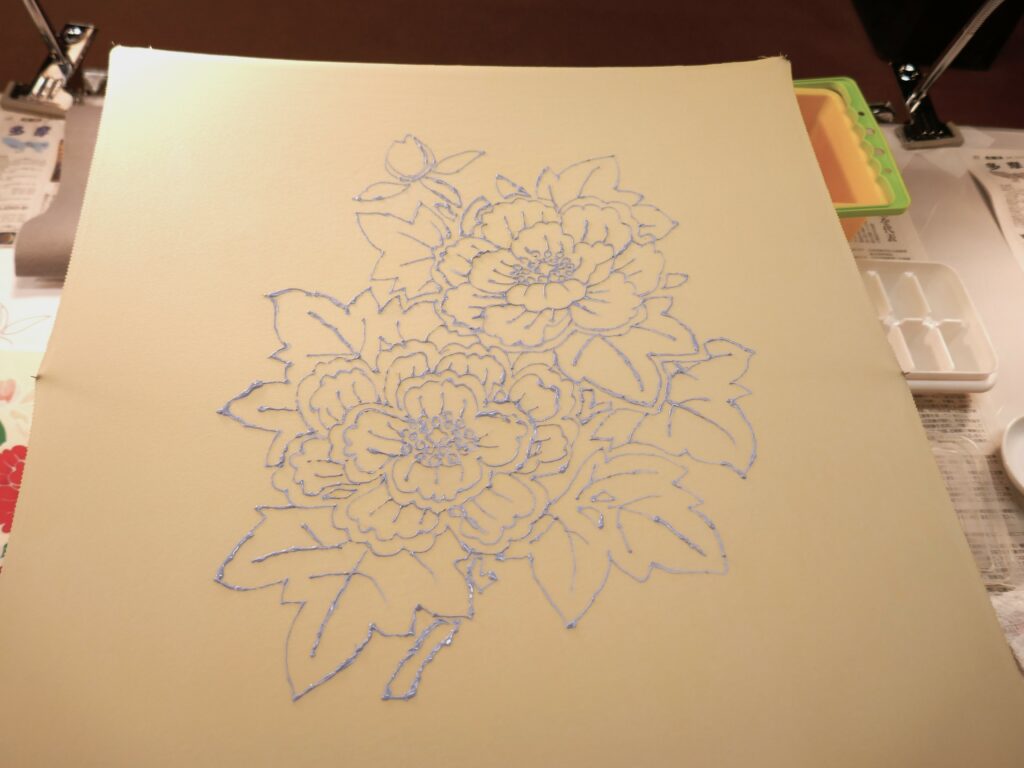 うらぶきする前は糸目糊が布に食い込んでいない状態なので、食い込ませるためにうらぶきします。