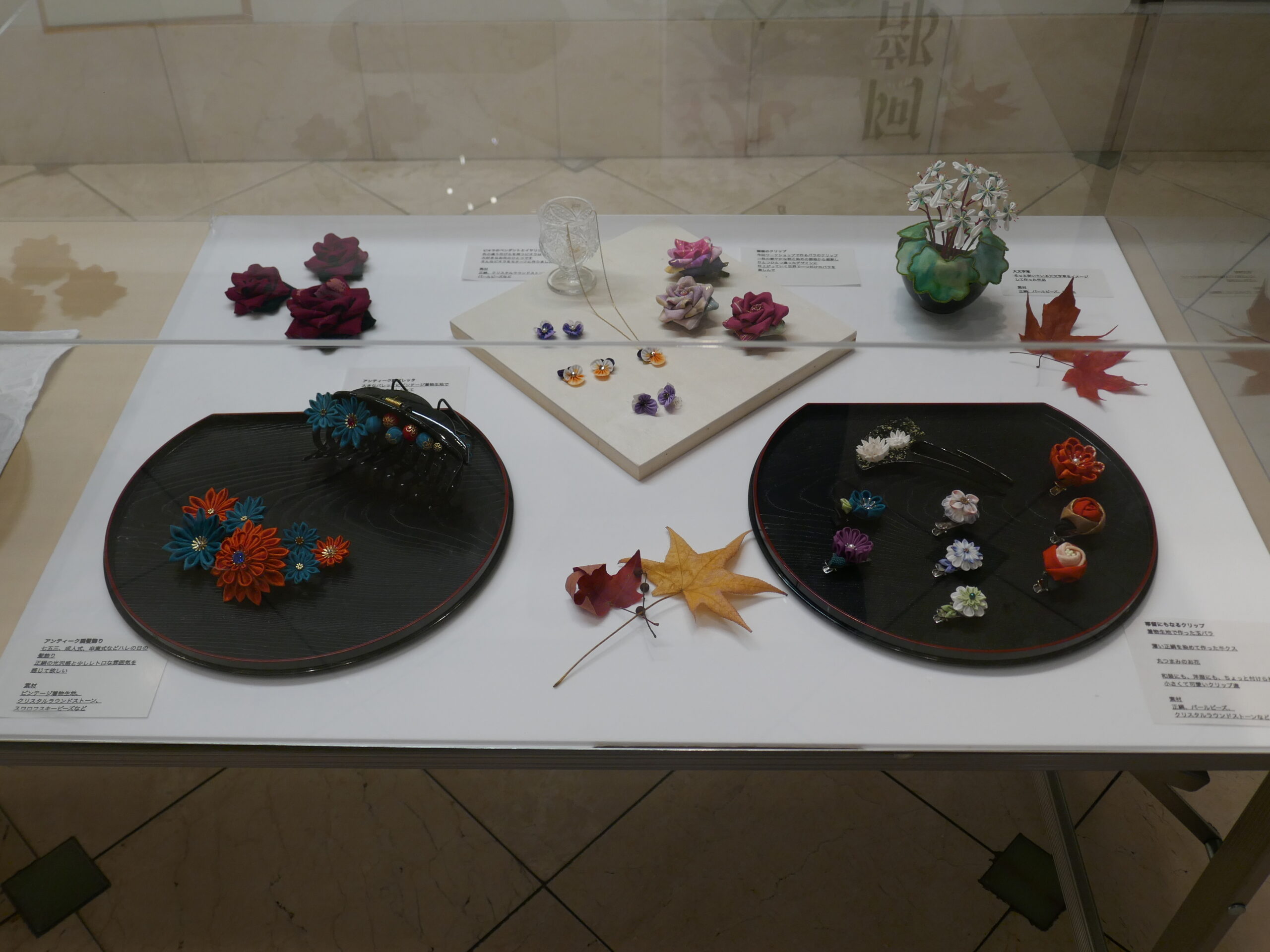 1階エントランスでは、臼井玲子さんの「つまみ細工」の展示を行っております。