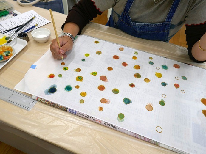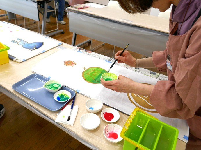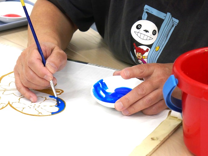 てぬぐいには、あらかじめ防染用ののりで図柄が描かれていて、自由に色を付けていきます。