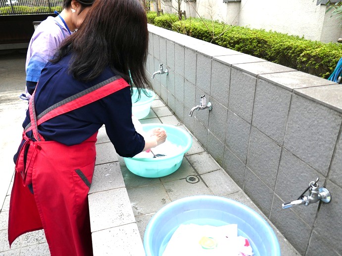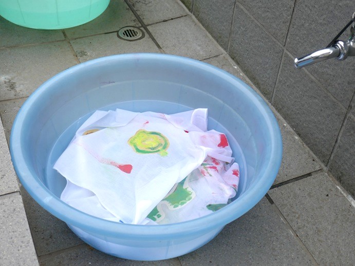 布が乾いたら、アイロンをかけて色を定着させ、お水に5分程つけた後、防染用ののりを洗い流します。